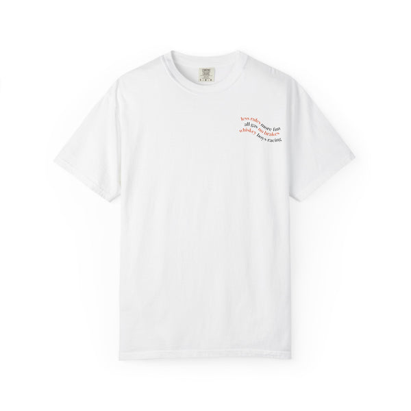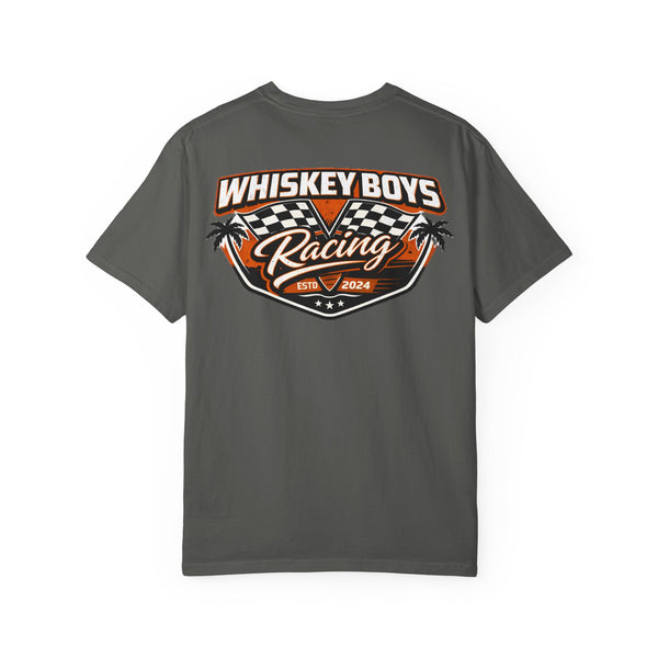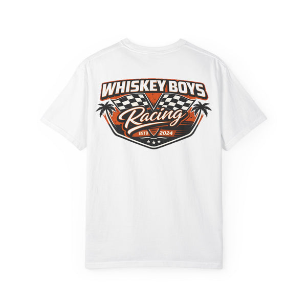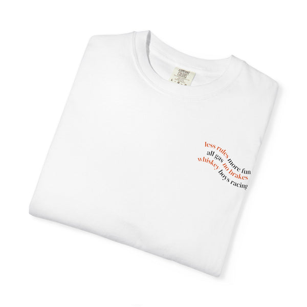 A relaxed, garment-dyed tee with a vintage racing vibe—soft, substantial cotton that wears in beautifully. The clean front chest script and bold back crest evoke late-summer race nights and backyard barbecues: sun-warmed asphalt, palm silhouettes, and a chequered flag caught in a warm breeze. It drapes casually over jeans or cutoffs and becomes more comfortable with each wash, showing off that lived-in look that feels personal and worn-in rather than mass-produced. Built to last with double-needle seams and tubular knit, this shirt sits comfortably in the rotation of anyone who loves Americana race culture, weekend car meets, or easygoing road-trip style.