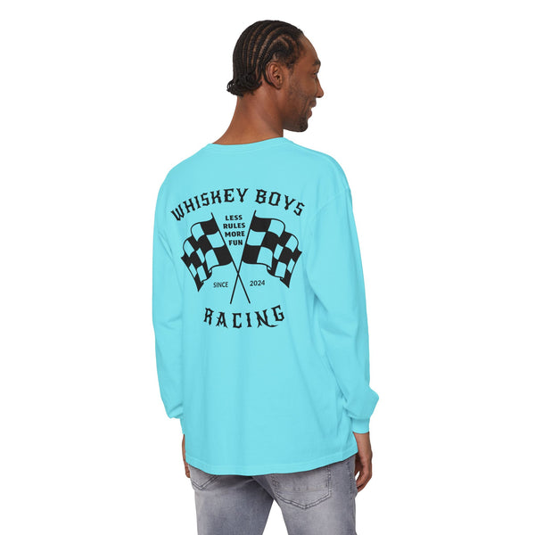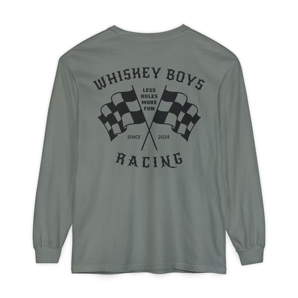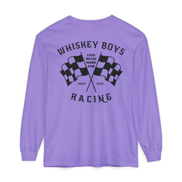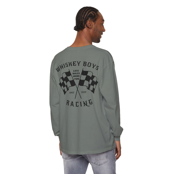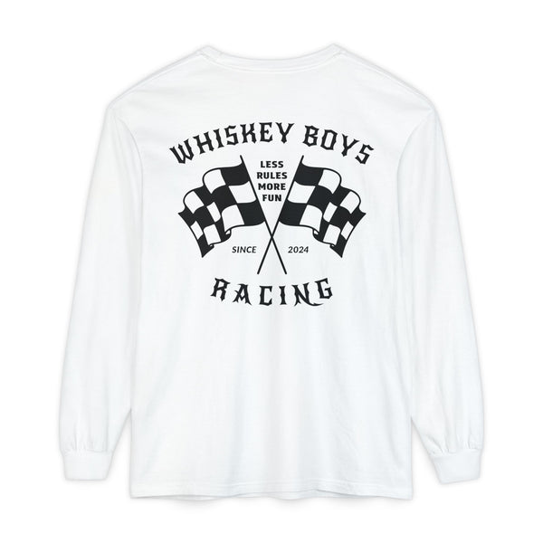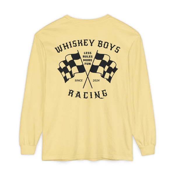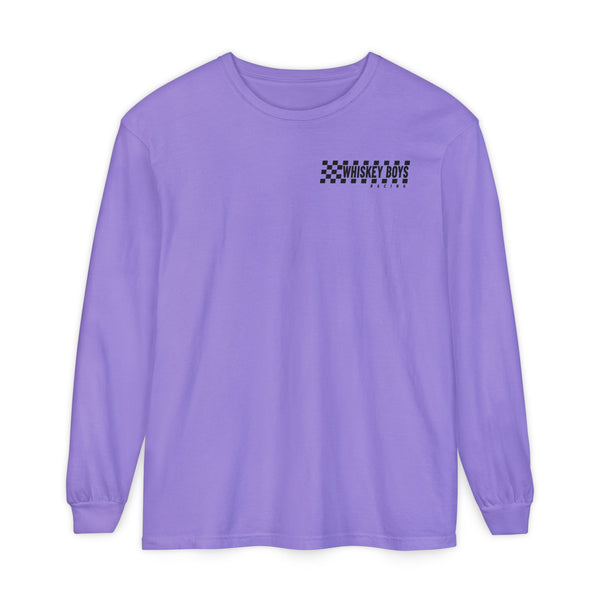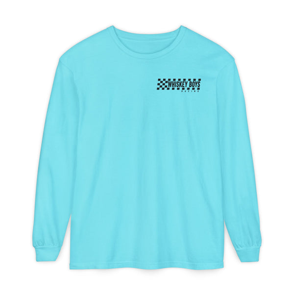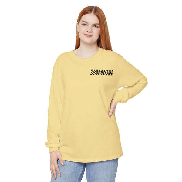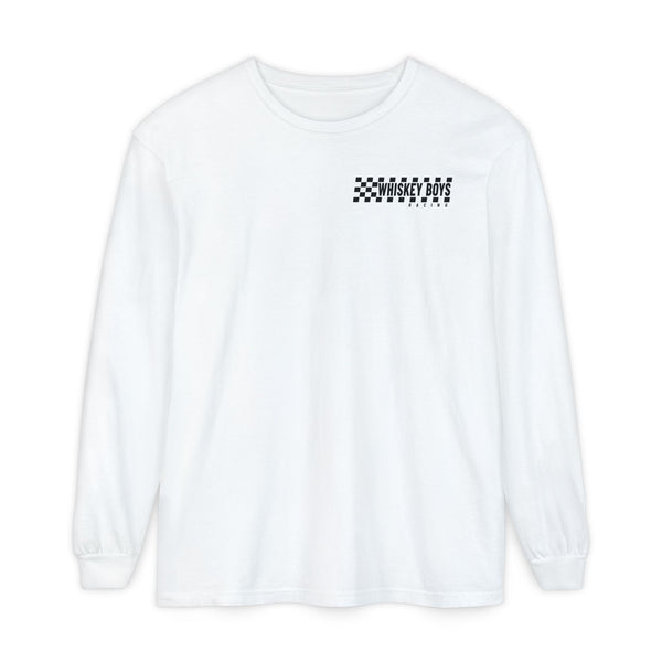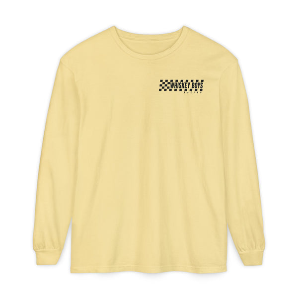 A laid-back long sleeve that feels lived-in from day one. Washed-down garment dye softens the cotton and gives each tee a subtle, vintage tone that works with faded denim or mechanic’s coveralls. The front carries a low-profile checkered detail, while the back bursts with crossed racing flags and a rugged ’Whiskey Boys Racing’ script—textured print that nods to backroad rallies, garage nights, and friends sketching race lines on napkins. The medium-weight ring-spun cotton holds shape and print without feeling stiff. Wear it on weekend drives, garage hangs, or chilly evenings by the bonfire; it settles into your rotation and keeps its character through washes.