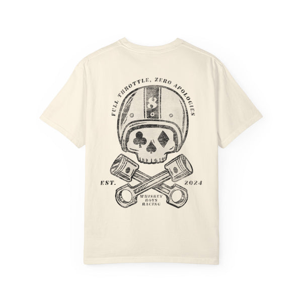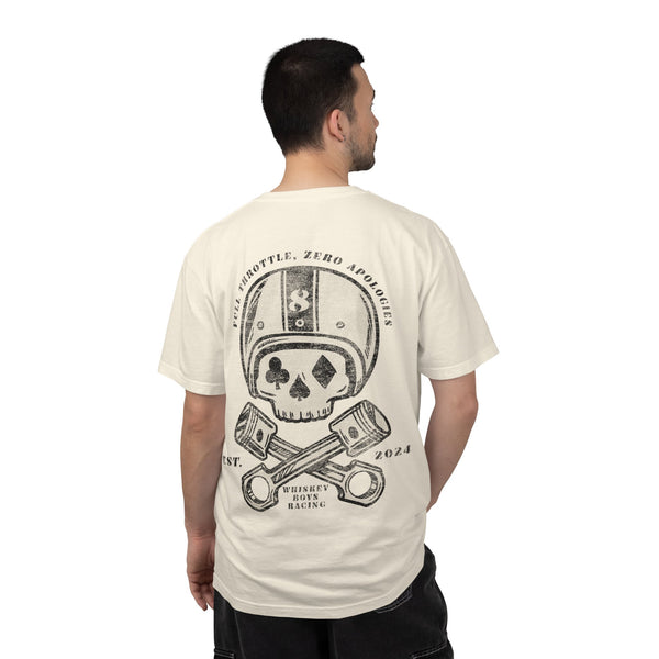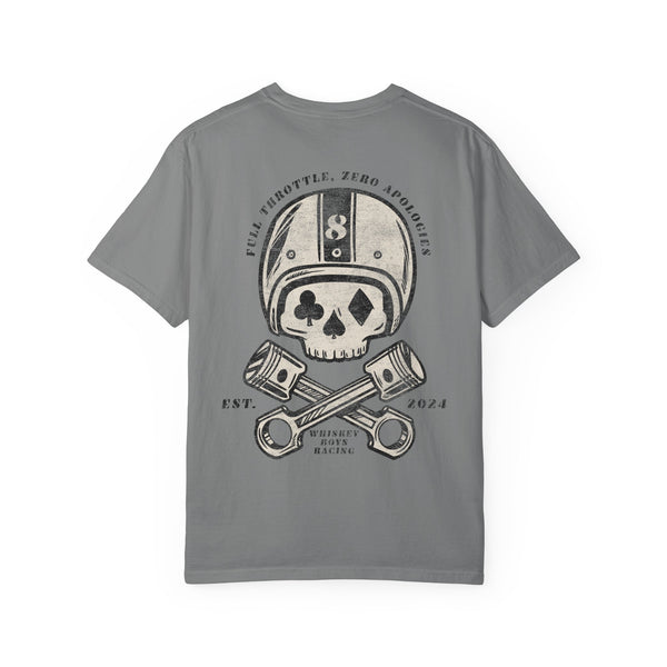 This heavyweight garment-dyed tee wears like a well-loved favorite from the first moment you pull it on. The relaxed fit and thick 6.1 oz cotton give it a sturdy, lived-in feel while the post-construction dyeing creates a soft, slightly faded finish that deepens with every wash. Front chest check pattern and bold back graphic—an old-school racer skull in a helmet with crossed pistons—give the shirt a gritty, vintage racing attitude. It sits comfortably for long days in the garage, weekend rides, or nights out with the crew, blending rugged style with everyday comfort.